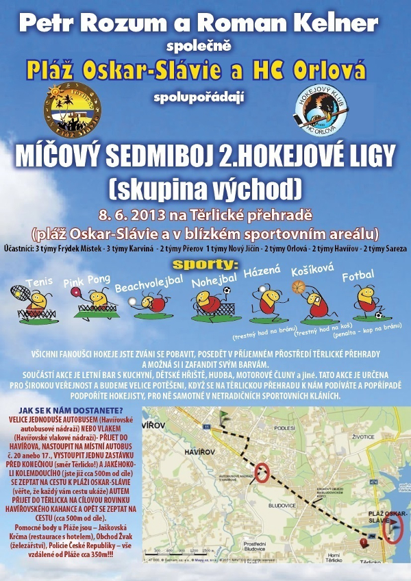Pokud jste na chvíli propadli euforii, tak se omlouváme za zavádějící titulek. Orlová skutečně s druholigovými týmy síly změří, ale zatím není jisté, zda to bude i na ledě. Prozatím si budeme muset vystačit s tím, že bývalý orlovský hráč Petr Rozum spolu se svým spoluhráčem z Frýdku Místku Romanem Kelnerem a také našim klubem pro vás na Těrlické přehradě uspořádali netradiční sportovní akci věnovanou druholigovým hokejovým klubům. Orlová byla pozvána jako jediný zástupce z krajského přeboru a do boje vyšle hned dva týmy! O co konkrétně půjde?