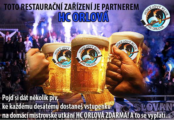 HC Orlová nabízí orlovským restauracím partnerský program. Každá restaurace či pivnice, která se rozhodne podpořit orlovský hokej finanční částkou, získá kromě reklamy na našem webu, facebooku, či mantinelech i vstupenky na domácí zápasy v hodnotě poloviny věnované částky. Ty pak může rozdávat svým návštěvníkům ke každému desátému pivu, čímž si zajistí klientelu z řad našich fanoušků, kteří se budou chtít odreagovat a zároveň ušetřit za vstupné na hokej. Fanoušci svou pivnici poznají podle následujícího plakátu, který restaurace od nás obdrží! Zájemci o program mohou kontaktovat vedení klubu.